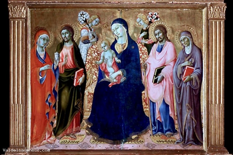 The large painting, created on a single surface and with a small temple-like upper section, resembles the external structure of the nearby Assumption of the Madonna by Vecchietta, located in the Cathedral.