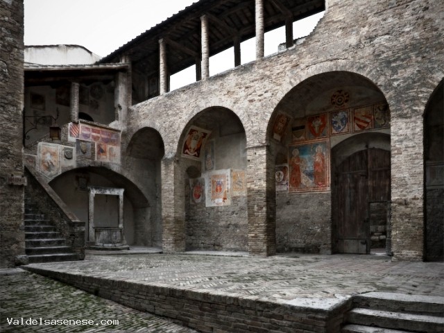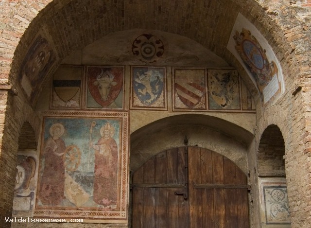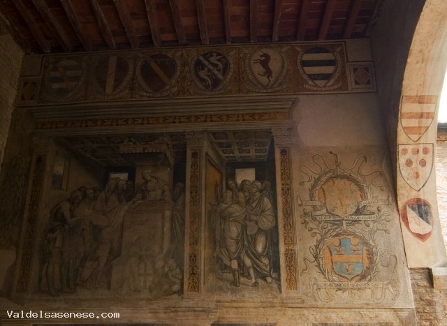 Tra gli affreschi, presenti nel chiostro, sono di notevole interesse un Sant'Ivo del Sodoma (1507), una Madonna con due santi (XIV secolo) e una Giustizia che calpesta la menzogna di Vincenzo Tamagni. Da qui parte la scalinata esterna per i piani superiori, coperta da una tettoia poggiata su colonne in laterizio.