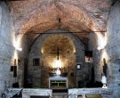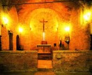 L'arco di sostegno del catino absidale poggia su due mensoleai lati dell'altare, anchesso realizzato in travertino.